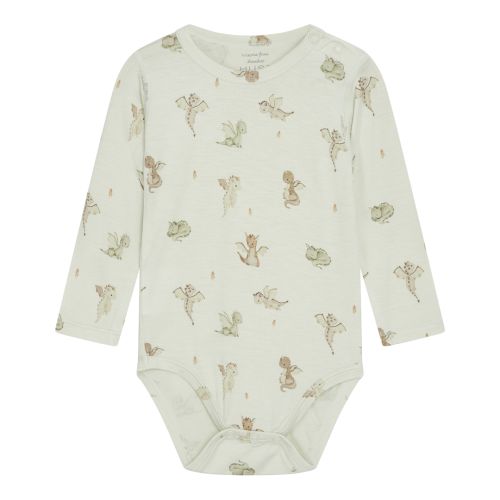 Langermet body i myk og tøyelig bambusviskose med dino print. Den praktiske kneppingen på venstre skulder og mellom bena gjør av- og påkledning enkel. Perfekt for sart hud, takket være pustende og temperaturregulerende bambusfiber.