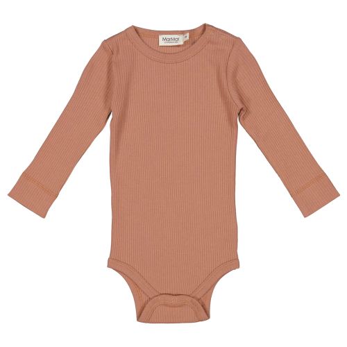 Langermet ribbestrikket body med knepping på den ene skulderen og mellom bena. Myk, elastisk og behagelig å ha på. 100% naturlig materiale og pustende kvalitet.
