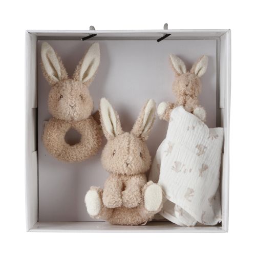 Baby Bunny kolleksjonen fra Little Dutch er den perfekte gaven til en nyfødt eller babyshower. Denne nydelige boksen inneholder tre myke ting å kose, klemme og leke med.