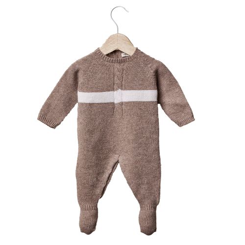 En nydelig heldress med perlestripe, strikket i myk og ekstra fin merinoull. Heldressen har lukking bak med treknapper, og trykknapper mellom bena som gjør det lettere å skifte klær og bleie. Perlestripe-designen gir en ekstra estetisk detalj som gjør dressen enda mer søt.