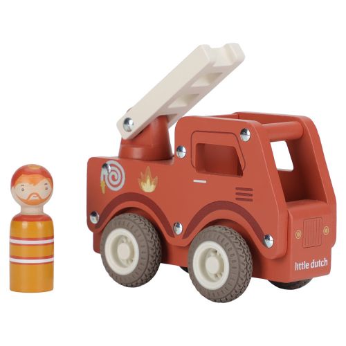 Slukk flammene og redd dagen med denne solide brannbil i tre. Den bevegelige stigen gjør hver redningsaksjon enklere, og gummihjulene sørger for en jevn og stabil kjøretur. Hjelp dyr ned fra høye trær og pass på at alle kommer i trygghet. Settet inkluderer en modig brannmann som alltid er klar til å rykke ut.