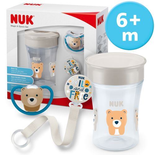 NUK Magic Cup rommer 230ml væske og er fri for BPA. I settet inngår også NUK Space smokk, hvor dens skjold er utformet for å forsyne barnets hud med optimal luftgjennomstrømming. Denne anatomiske smokken er passelig fra 6 måneders alder. Smokkholderen festes enkelt med clips og passer både smokker med skjold og ring.