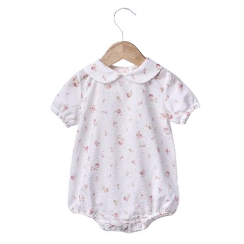 En nydelig kortermet body med delikat blomsterprint. Den lette bomullskvaliteten gjør den ideell til vår- og sommerdager, og det romantiske mønsteret med rosa blomster på perlehvit bakgrunn gir et tidløst og sjarmerende uttrykk. Bodyen lukkes enkelt med perlemorsknapper i ryggen og mellom bena – både praktisk og elegant.