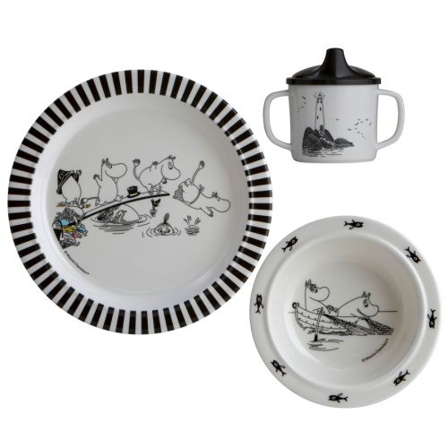 Koselig tre-delt melaminservice med Mummimotiv. Antiskli under koppen og den flate tallerkenen, skålen har sugekopp og koppen er sølefri og har to håndtak som gjør den enkel å holde. Kan vaskes i maskin på øvrre hylle og tåler oppvarming i mikrobølgeovnen (maks 800W, 1 min).