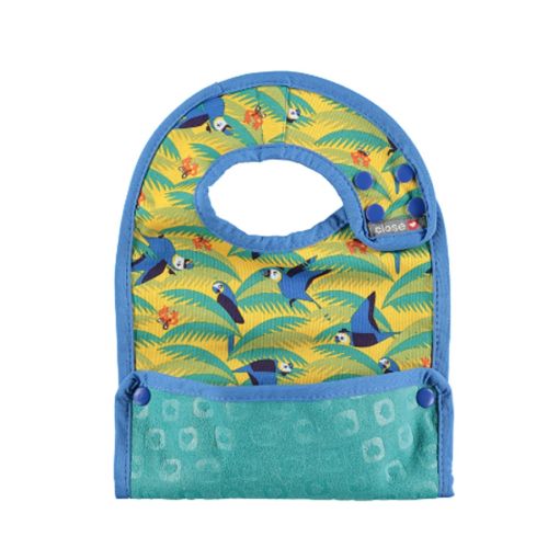 Smekken kommer med en praktisk brett-opp-funksjon som lager en oppsamlerlomme. Festes enkelt med to knapper, men er vanskelig for den lille å fjerne.