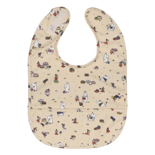 Praktisk smekke med mummimotiv som beskytter klærne mot smuss og søl. Frontlommen samler opp maten og den festes enkelt med borrelås i nakken. Smekken er laget av PU-behandlet resirkulert polyester, som er et mykt og behagelig materiale. Tørk av smekken med en klut eller skyll under rennende vann etter hver bruk.