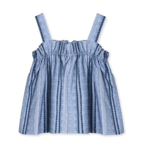 Gi antrekket ditt en frisk og sommerlig touch med denne nydelige toppen i myk bomull. De brede stroppene og den lett rynkede overkanten gir en flatterende passform og et feminint uttrykk. Det dekorative stripemønsteret i delikate blåtoner tilfører en luftig og avslappet stil som passer perfekt til både jeans, shorts og skjørt. Denne toppen er et must-have for sesongens varme dager, og kan enkelt dresses opp eller ned etter anledning.